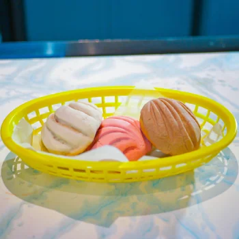Two homemade vanilla mini conchaz, scrambled eggs, your choice of bacon or sausage patty, plus papas fritas.