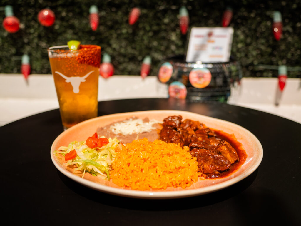Tender pork simmered low & slow in a rich tomato-onion gravy, served with rice, beans, and warm tortillas.